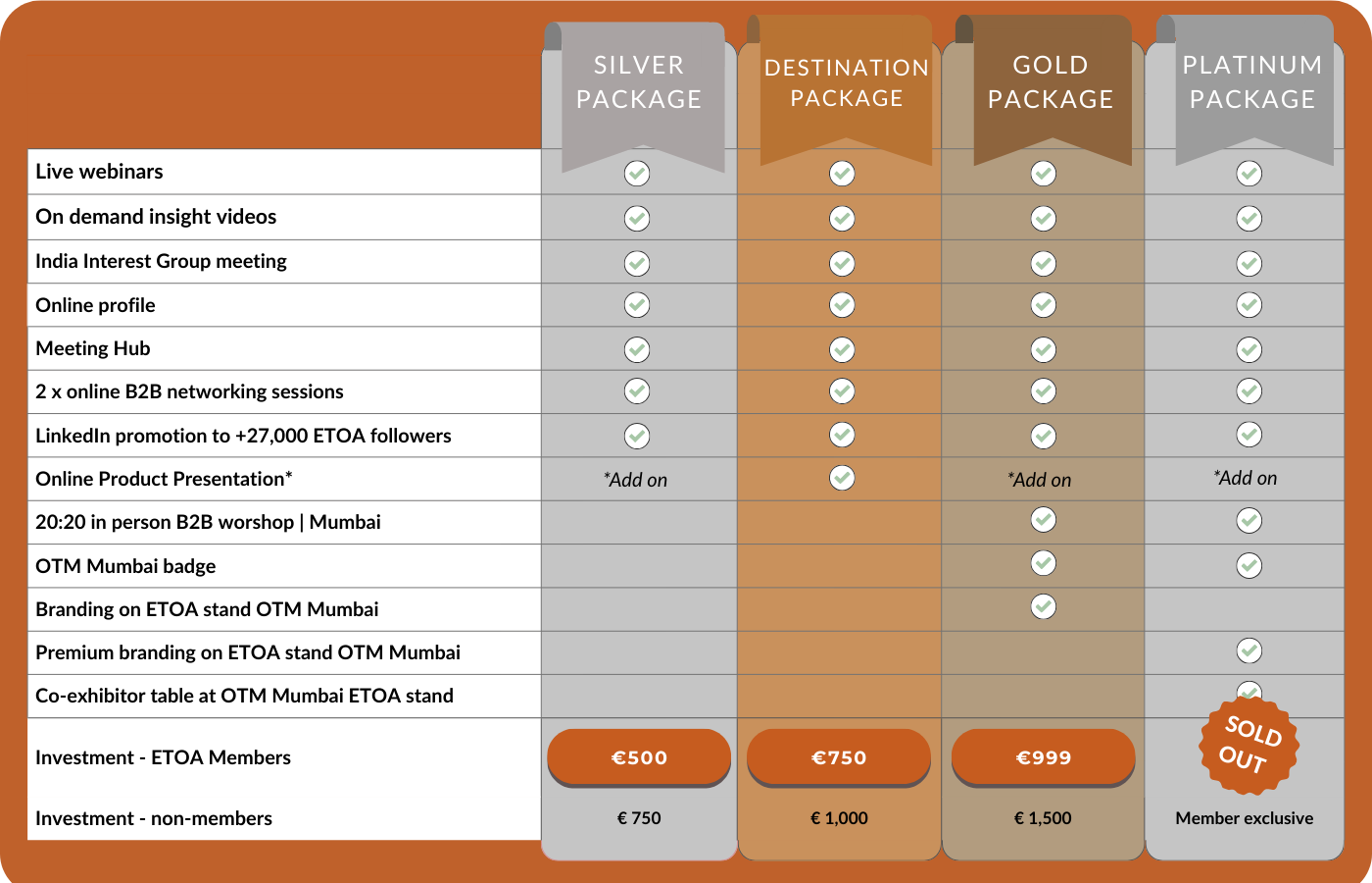 Check out what’s included in each package below. These packages are for European suppliers, destinations and wholesalers/DMCs who would like to meet outbound Indian buyers.