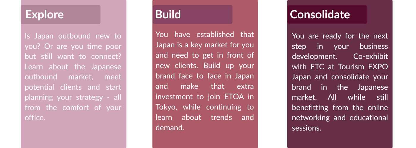Showcase: Outbound Japan has tailored options for you, regardless which stage you are at. If you are curious about the Japanese outbound market, if it’s already part of your growth strategy, or if you are an established player in the market, there are options suitable for you.