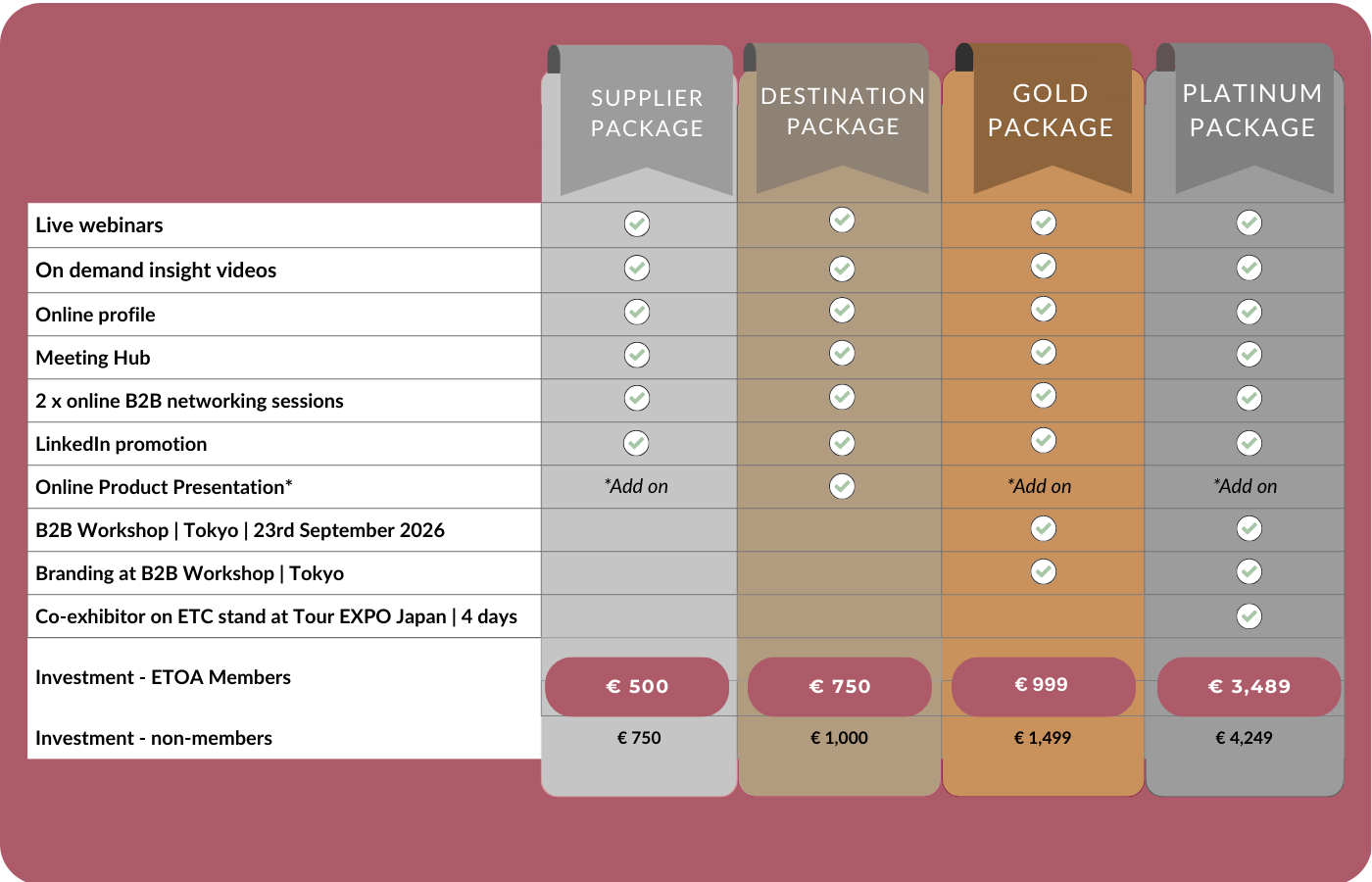 If you are an ETOA member, you will see the discounted package price after logging in.