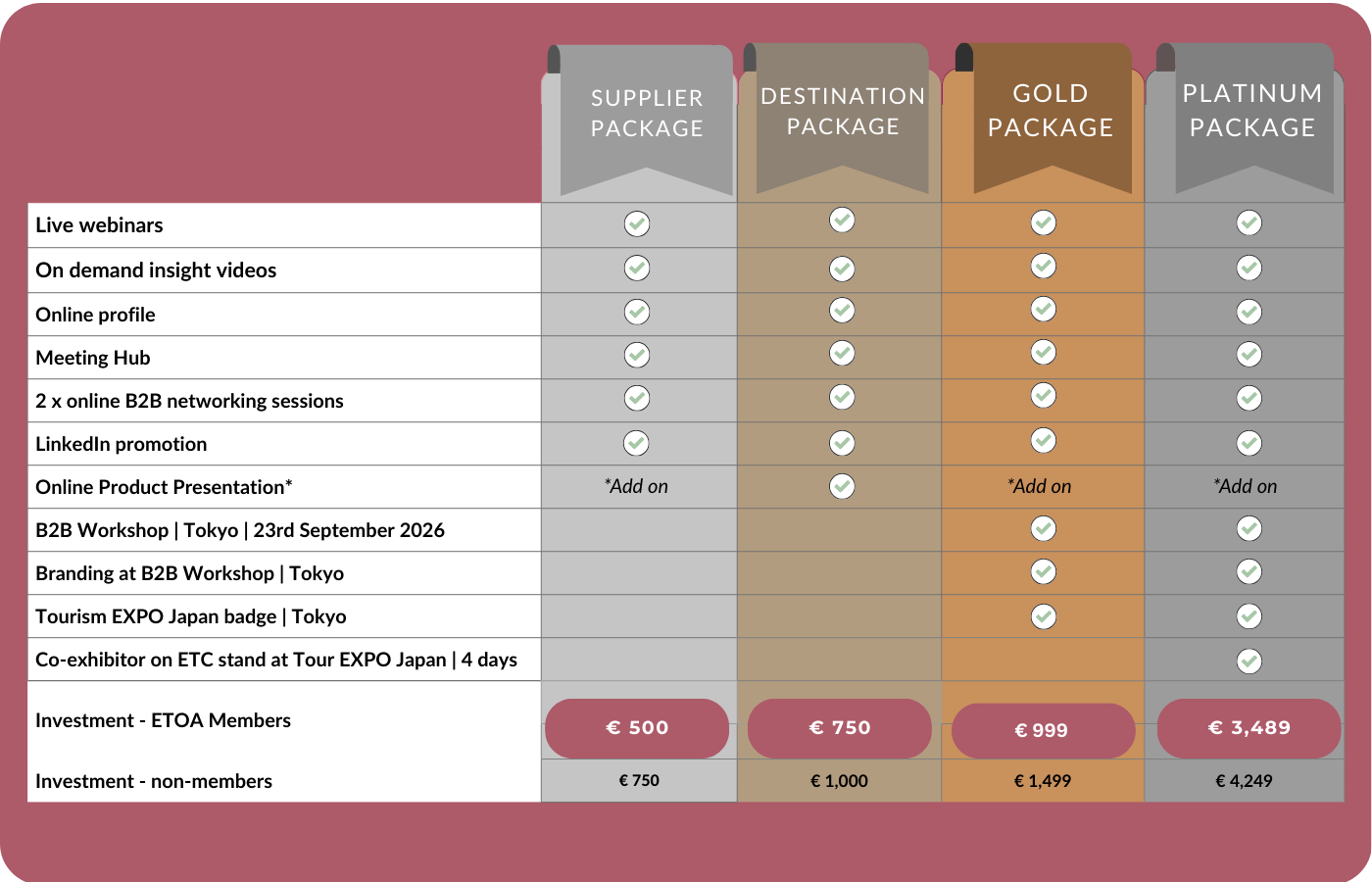 If you are an ETOA member, you will see the discounted package price after logging in.