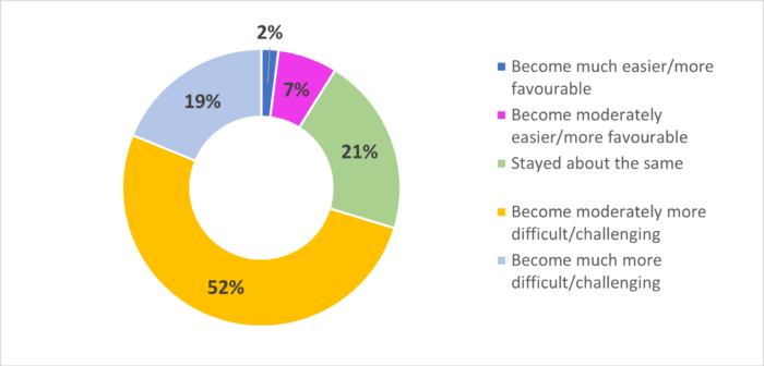 There is a strong negative shift in sentiment compared with this time last year, with 70% feeling conditions have become more difficult (52% moderately more difficult, 19% much more difficult). 20% say conditions are unchanged, whilst 8% report improvement.